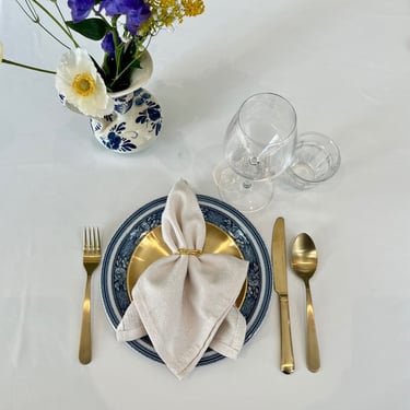 Tafeldecoratie • Een unieke samenstelling van servies • volledig in stijl • in meerdere lagen gedekt • katoenen servet • servetring • vork, mes, lepel • wijnglas • waterglas